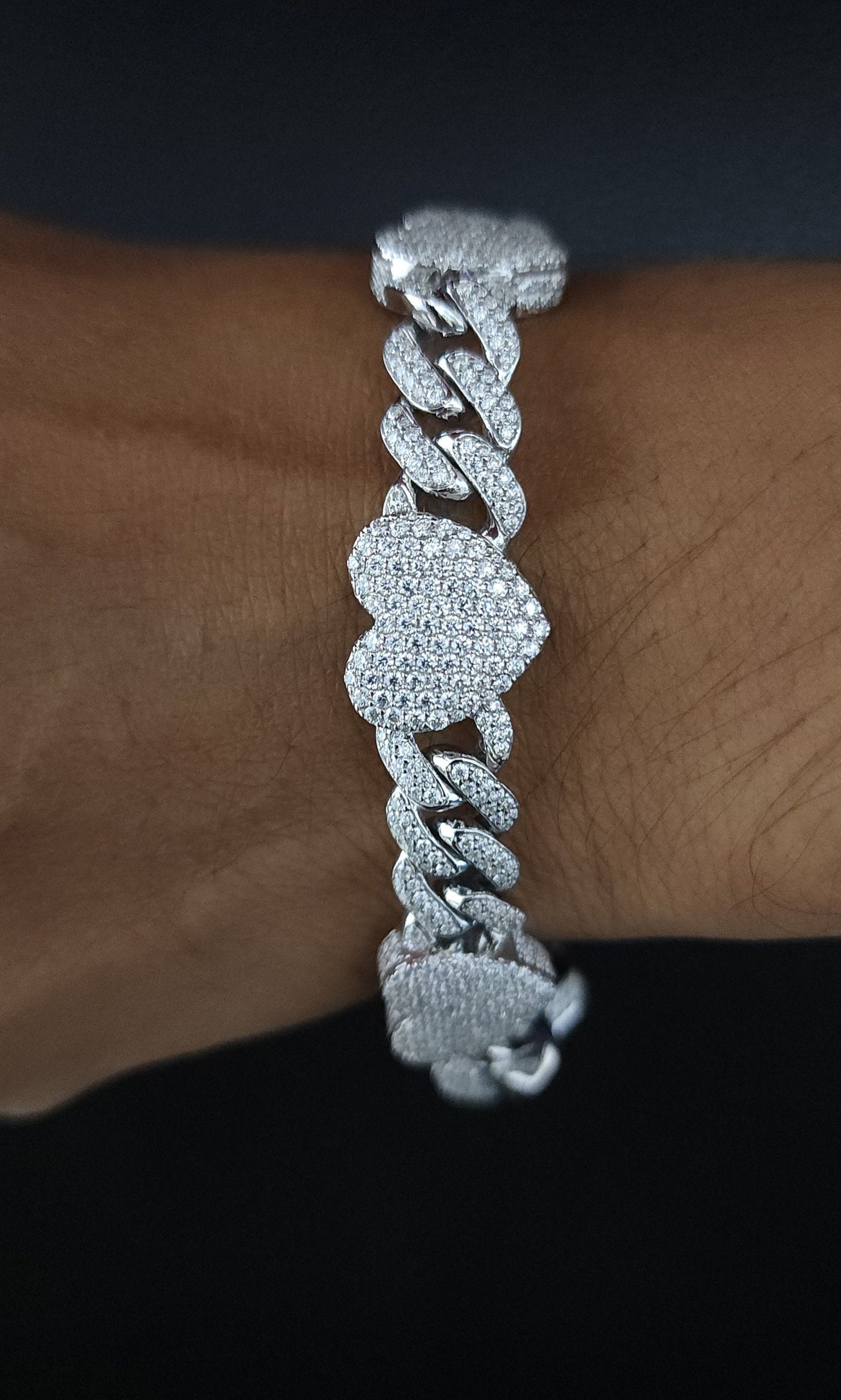 Iced Out Heart Cuban Link Bracelet Made in 925 Sterling Silver Embellished With Shinny Moissanite Diamonds For Birthday And Anniversary Gift